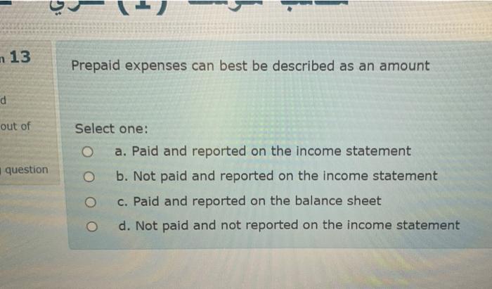 Not paid and reported on the income statement O c. A prepaid expense can best be described as an amount a. Paid and not currently matched with revenues.